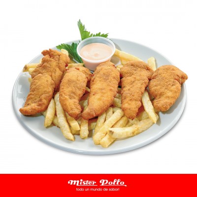 Solomillos de pechuga apanados, acompañados de papa a la francesa y salsa rosada